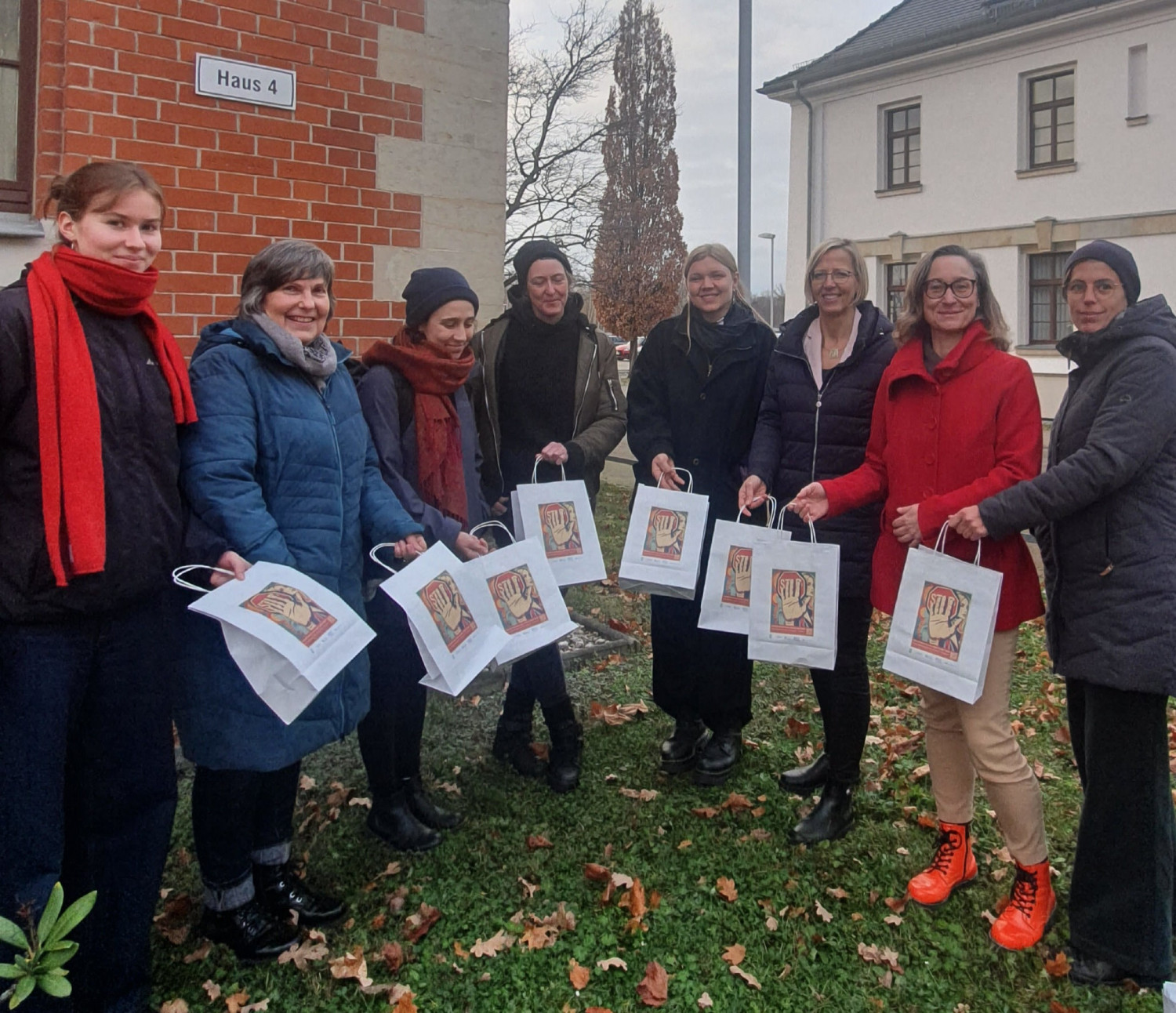 Kerstin Kupfer vom Wegweiser e.V. (2.v.l.), die Zweite Beigeordnete des Landkreises, Ines Lüpfert (3.v.r.), die Gleichstellungsbeauftragte des Landkreises, Konstanze Morgenroth (2.v.r.) und weitere Unterstützerinnen der Aktion, wollen auf die hohe Zahl der von Gewalt betroffenen Frauen aufmerksam machen.